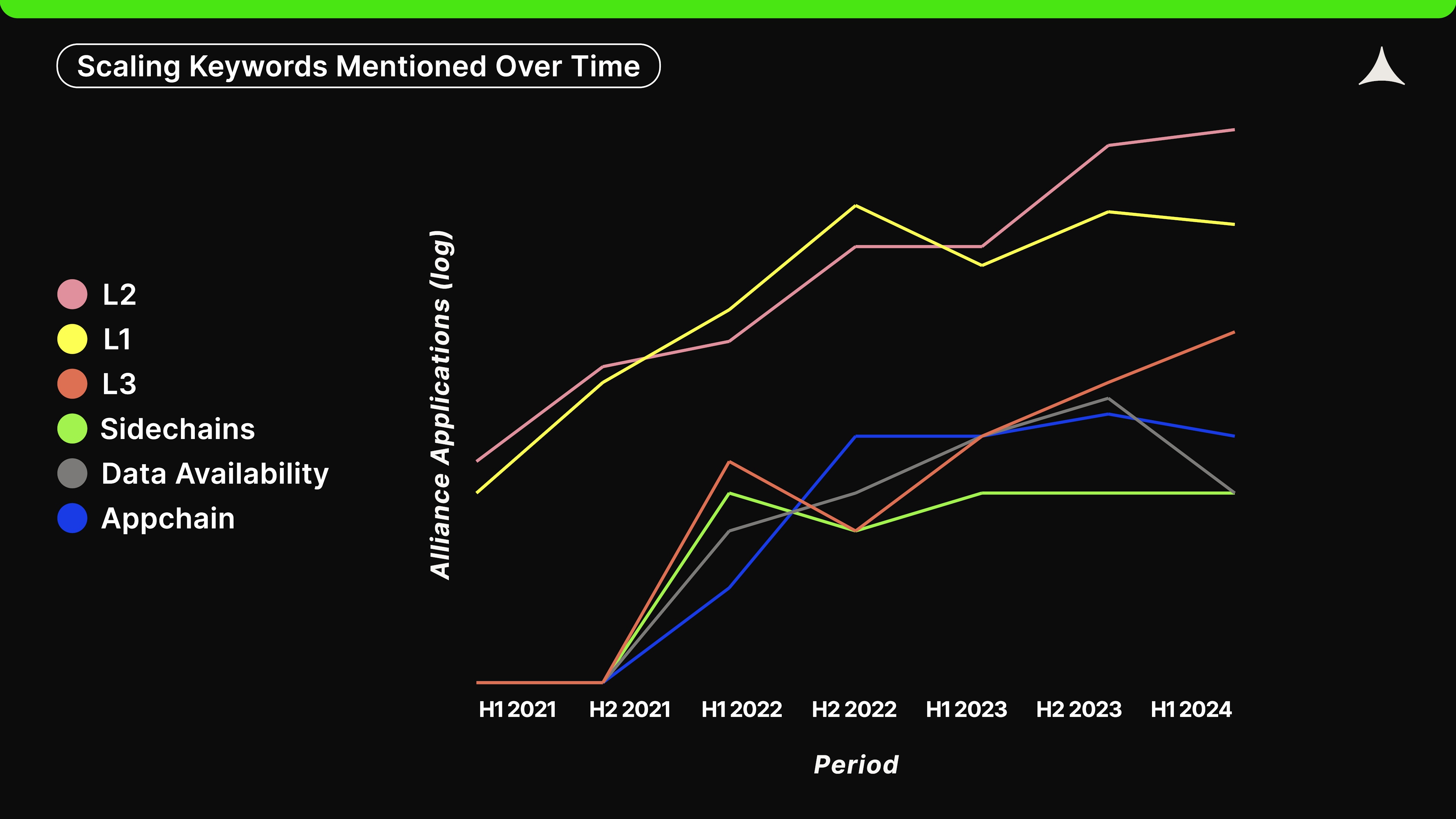 - Buzzwords that have been growing in popularity within the last 12 months include fully homomorphic encryption (FHE), chain abstraction, meme, SocialFi, prediction market, liquid staking, restaking, RWA, stablecoin, L1, L2, and L3.