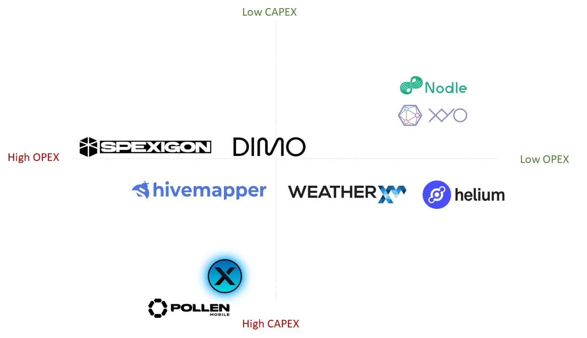 This is the ongoing operating cost paid by the user for active participation in the network. Examples include the energy cost and time needed to map an area using Hivemapper or Spexigon. We refer to these as Opex costs. High Opex costs means that participants need to get paid quicker and more frequently for their contributions. It also means that participants will need to sell a considerable portion of the earned token reward to cover their operating costs creating a continuous selling pressure on the token price. This pressure needs to be balanced by demand, i.e., native token buying pressure, to protect the native token’s price from going into a downtrend that can shake the participants’ confidence in the network. Networks that require high Opex can often benefit from a gradual growth strategy to balance the supply and demand sides.