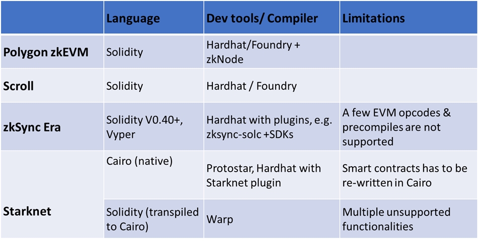 Building applications for type-4 zkEVM require more developer effort because there are limits on the Solidity code that can be used. Alternatively, developers can decide to learn a different language, e.g., Cairo, to develop native applications for these frameworks.