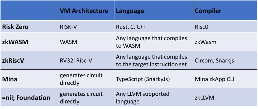 Sources: Risc0, zkWasm, Circom, Snarkjs, Mina zkApp CLI, zkLLVM
