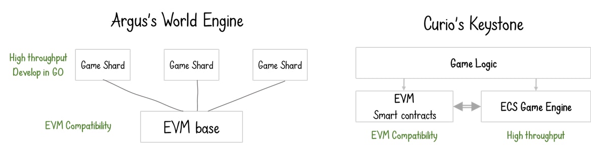 Examples of this approach are World Engine from Argus and Keystone from Curio. The World Engine separates the execution of the game logic into a separate layer called Game Shard that runs on top of the EVM compatible layer. The Game Shard is also designed to allow horizontal scaling to adjust the total rollup throughput based on demand. Similarly, Curio’s Keystone architecture bundles a high-throughput game engine with the EVM as the rollup execution environment. The challenge here is to achieve seamless interoperability between the EVM engine and the game engine.