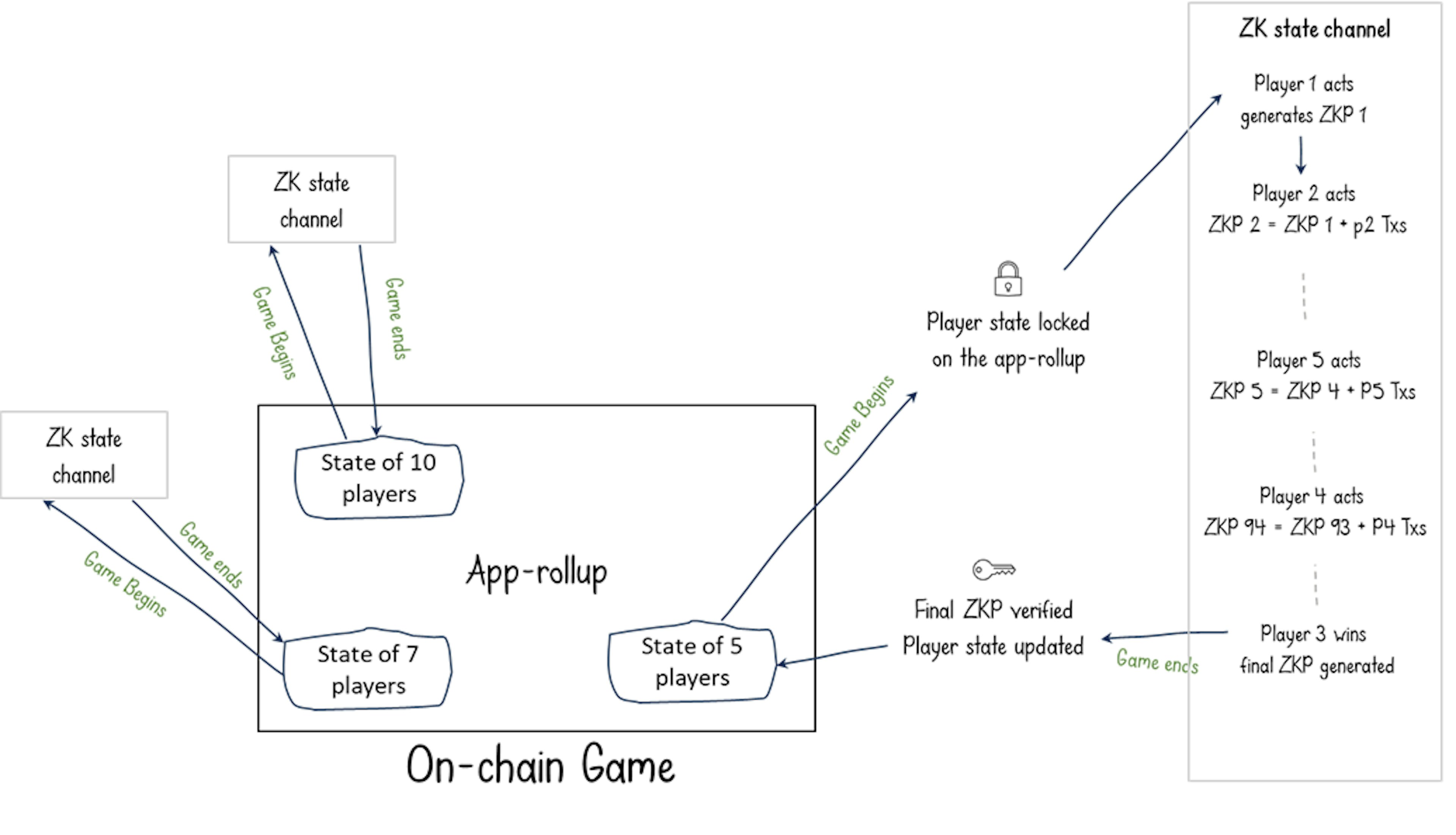 In this case, the app rollup represents the shared information layer where game results are stored and where the game assets exist. For each game on the rollup, a ZK State Channel can be initiated to serve this game. During the game play, each player generates transactions and creates a ZKP proving that they have followed the rules of the game. Proofs from other player interactions aggregate previous proofs using recursive proofing. When the game ends, the final ZKP is submitted to the app rollup to prove the validity of the game play and the validity of the final result. The resulting state change from the game changes the player states on the app rollup.