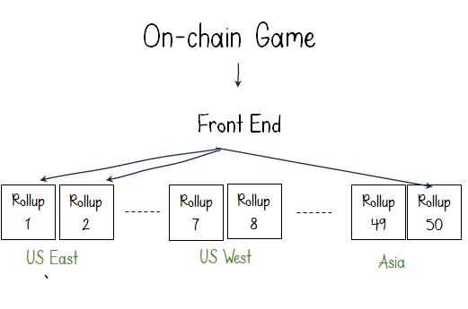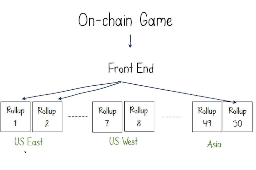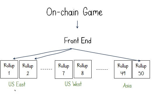 Horizontal scalability means simply deploying multiple app-rollups (OP or ZK) with the same smart contract deployed to all rollups. The application’s front end seamlessly directs the user to one of the rollups depending on capacity, location, or specific application options. Alt Layer recently demonstrated this concept by launching a scalable 2048 FOCG. In the game’s frontend, the user has the option to select which rollup to join based on their geographical location. Because of simplicity and availability of Rollup-as-a-service providers such as Caldera who handle all the infrastructure work related to spinning and managing these rollups, this approach can be easily adopted by game developers.