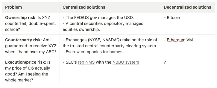Problem 2, counterparty risk: Is my trading partner going to run away with my ABC if I hand it over first? In centralized systems, exchanges take on the role of the trusted central counterparty clearing system to enable trade. Escrow companies do it for homes. But Ethereum was the first to enable decentralized trades.