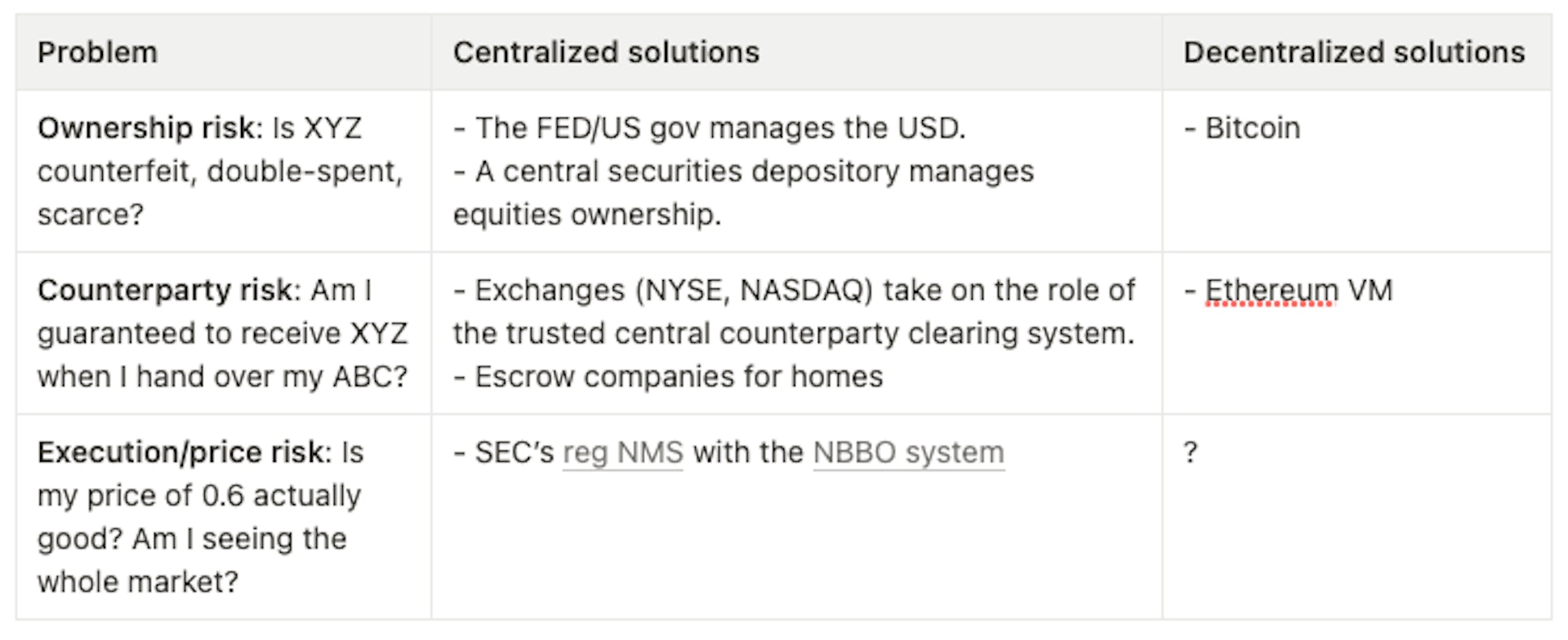 Problem 1, ownership risk: Is asset XYZ own-able? As in it’s not a counterfeit, it hasn’t been double-spent, it’s credibly scarce, it’s resistant to thieves, etc. If XYZ is the USD, we trust the US government to give it those desirable properties. If XYZ is equities, a central securities depository is in charge. But Bitcoin was the first to enable decentralized ownership.