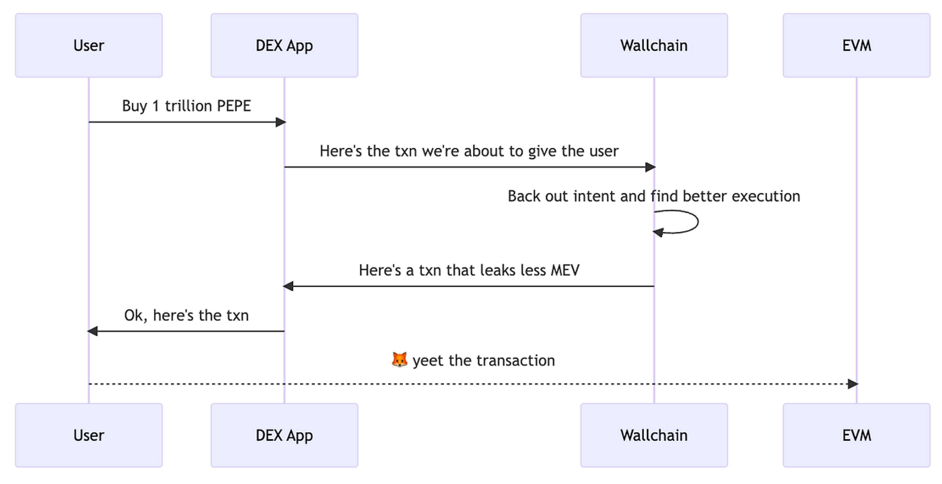 Diagram 3. Sequence of a transaction being produced by a dApp, analyzed and potentially replaced by Wallchain. The enriched transaction helps the user reclaim MEV.