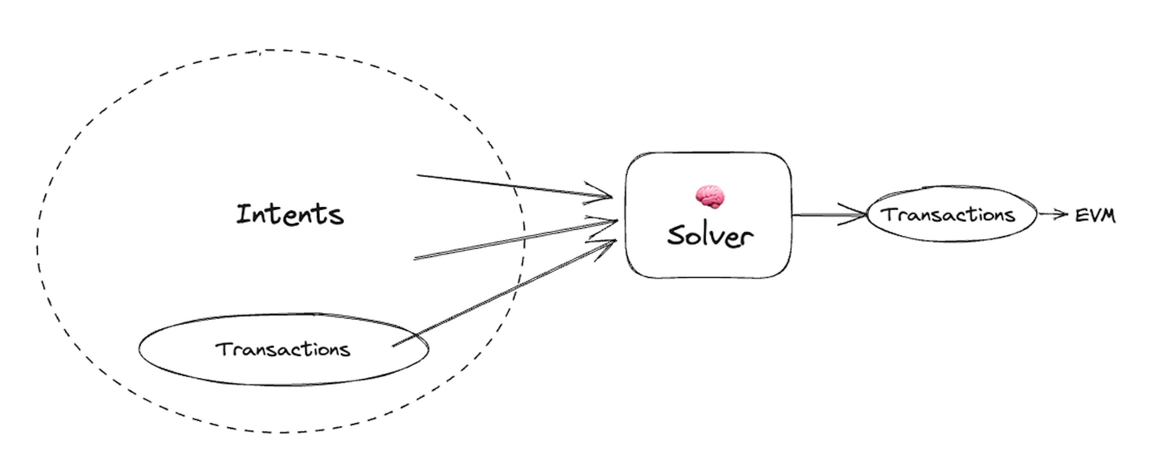 Solvers aggregate intents and produce valid transactions. All transactions are intents. To see that, simply run the transaction (txn) successfully and the set of possible state changes is the intent. Some simple intents can be written as transactions, but may not be valid immediately. E.g. Limit orders are transactions that are invalid in the current state of the EVM, but become valid transactions when matched.