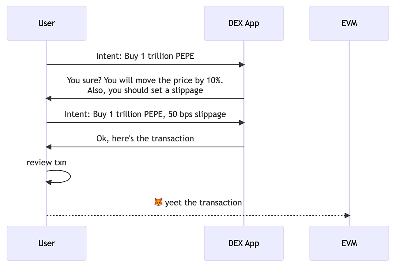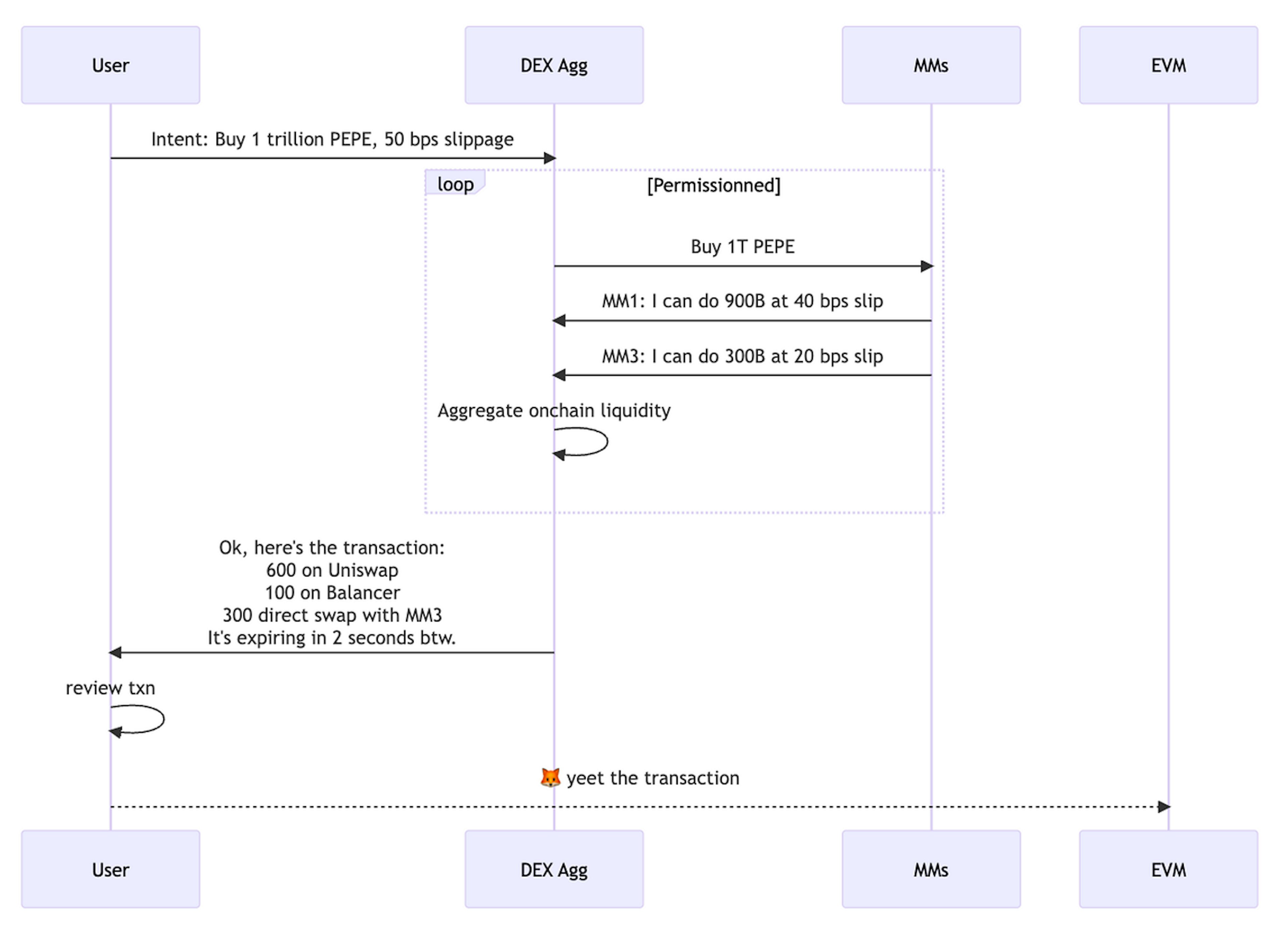 Diagram 1. Sequence of a swap on a dex, or purely on-chain dex aggregator