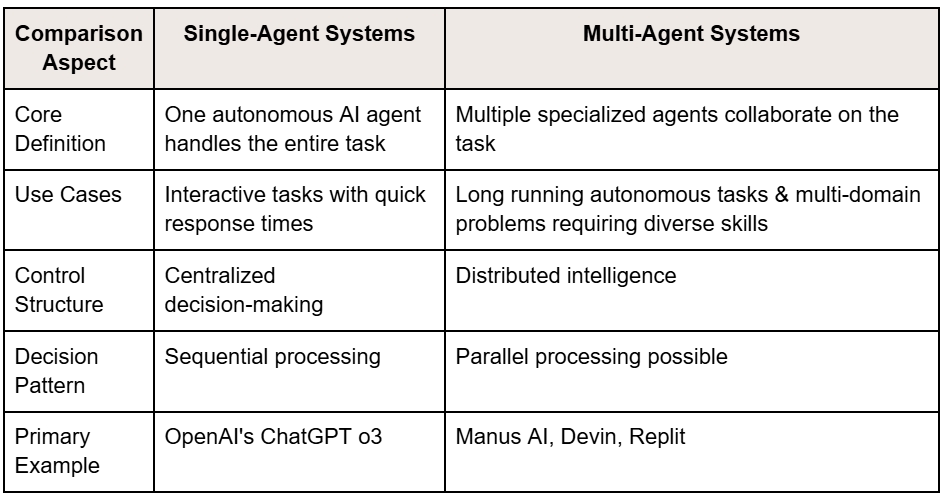 The single-agent vs. multi-agent system decision represents a design choice between simplicity and specialization. Single agents excel at interactive tasks requiring quick responses and unified reasoning, while multi-agent systems shine when tasks demand diverse expertise, parallelism, and long-term execution.