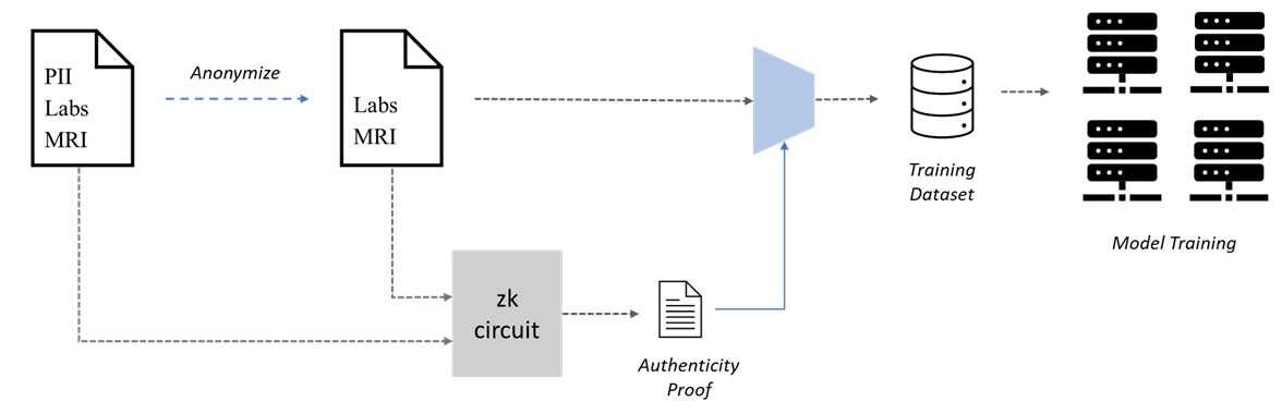 However, the authenticity of the anonymized medical records is a concern, as fake data can significantly impact model performance. To address this dilemma, zero-knowledge proofs (ZKPs) can be used to verify the authenticity of anonymized medical records. Patients can generate ZKPs to demonstrate that anonymized records are indeed copies of the original records, even after removing personally identifiable information (PII). This way, patients can contribute the anonymized records along with the ZKPs to interested parties, and even get rewarded for their contribution, without sacrificing their privacy.