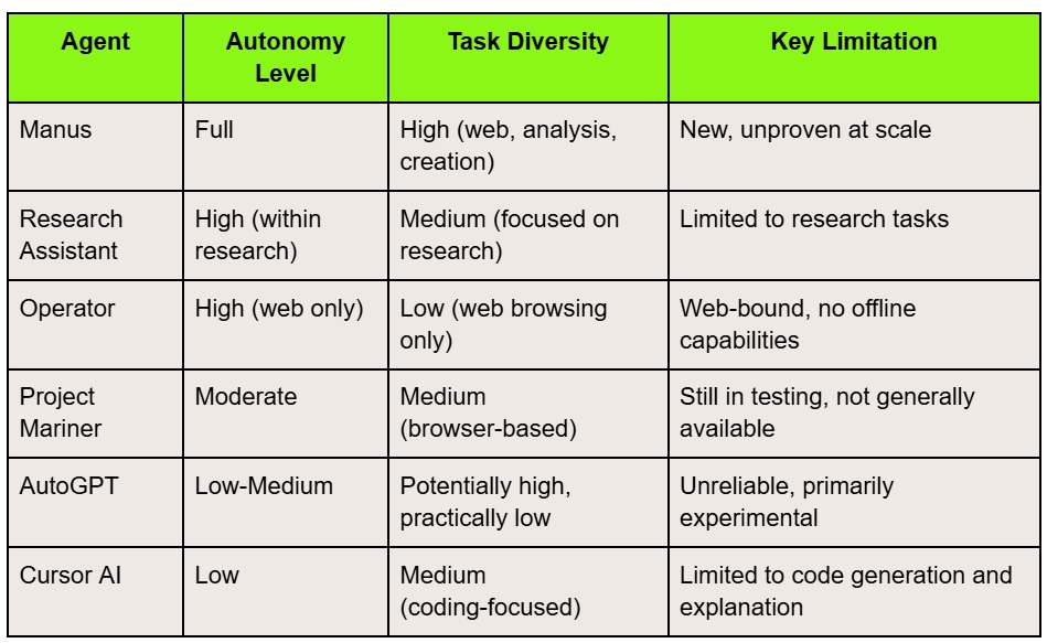 To better understand Manus's position in the current landscape, the following table compares key characteristics across the major AI agents available today: