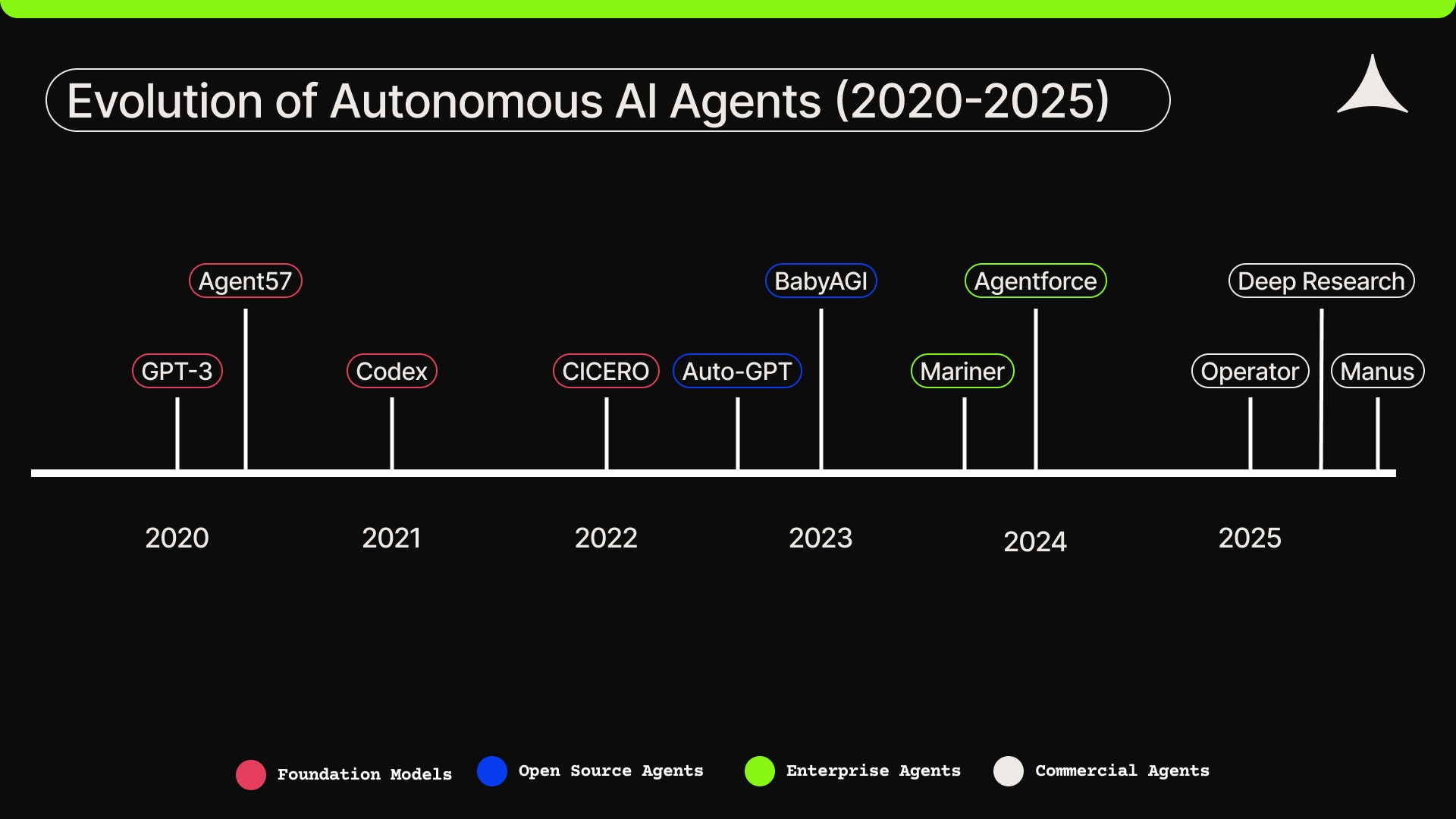 This compressed timeline illustrates the accelerating pace of innovation in the AI agent space. Notice how early 2025 began with a Cambrian explosion of commercialized agentic functionalities.