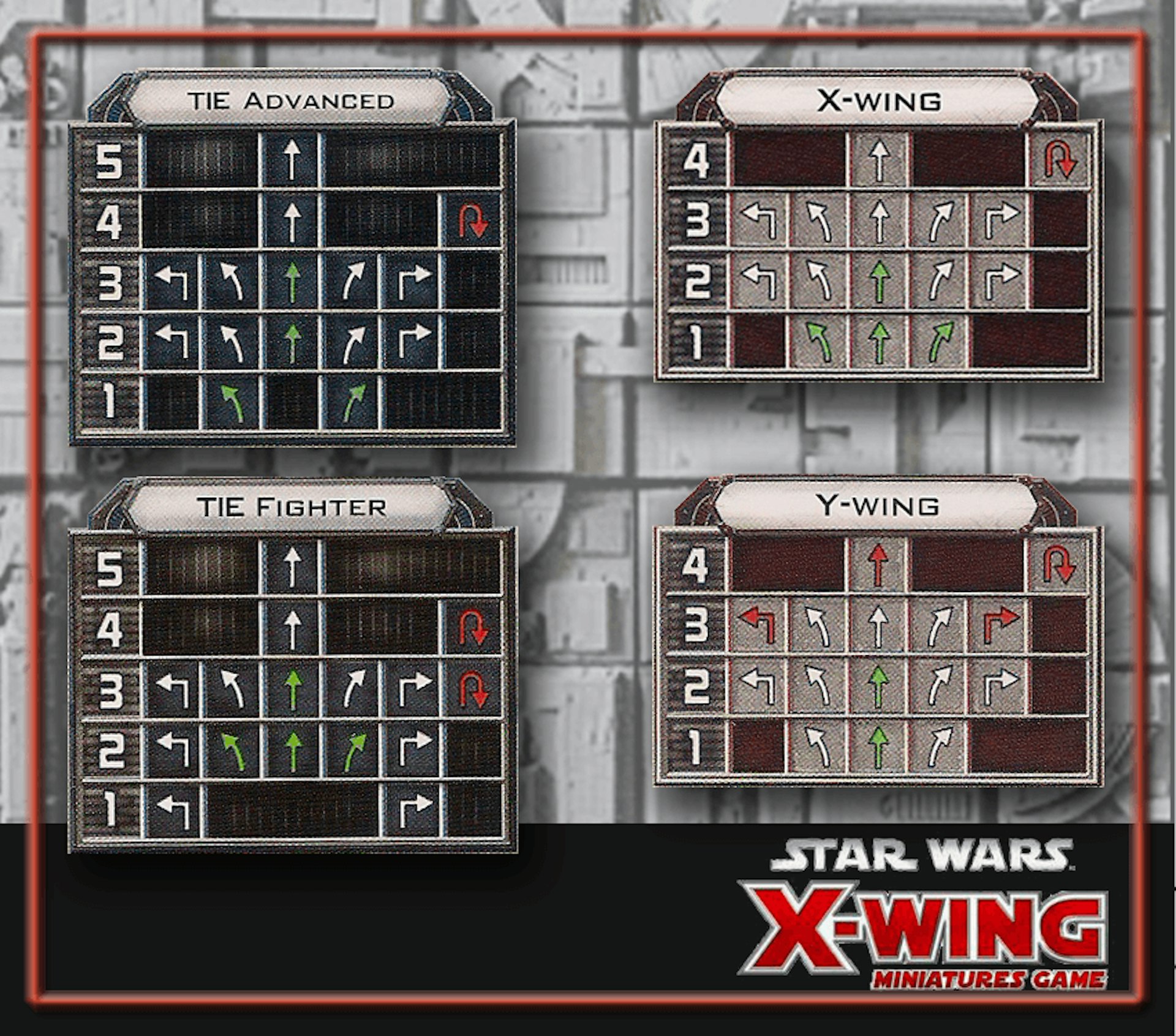 Available movements of select ships (Star Wars X-Wing).