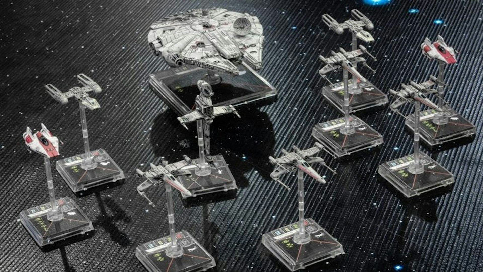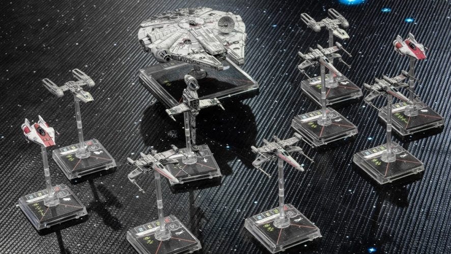 To setup the game, you first need to a choose a fleet size. Each ship costs something between 10% and 50% of your fleet’s allowance, depending on the model, the pilot and the equipment inside. A medium-sized game could feature three well-equipped B-wings versus seven TIE Fighters, or a Squad of A-wings carrying Proton Rockets lead by the Millennium Falcon versus a pair of Lambda Shuttles and Darth Vader piloting a TIE Advanced x1.