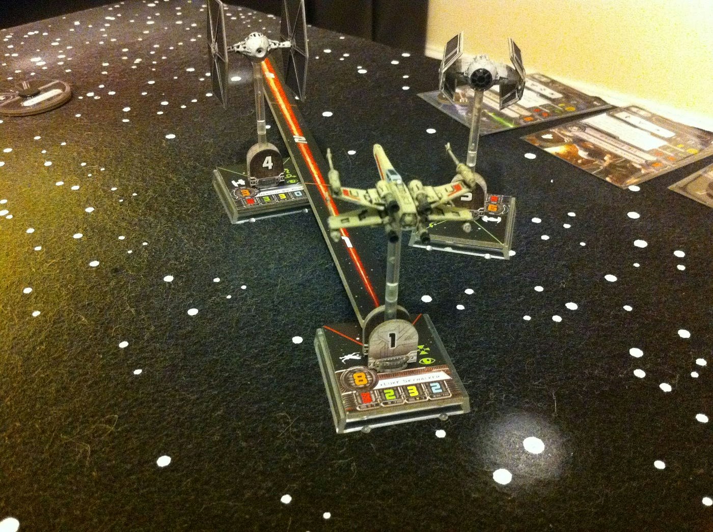 Once everyone has moved their ships, the game enters the firing stage. Here, ships can choose to fire on enemies in their firing arcs. Most will be able to use weapons on targets a few inches away. Some have longer range. In the image below, you can see an X-wing has successfully maneuvered itself to shoot a TIE Fighter at close range. It will get to roll three attack dice and have a good chance of blowing it’s enemy up. If it doesn’t, the following turn will see both ships blow past each other, giving an advantage to the more manoeuvrable TIE to end up on the X-wing’s tail.