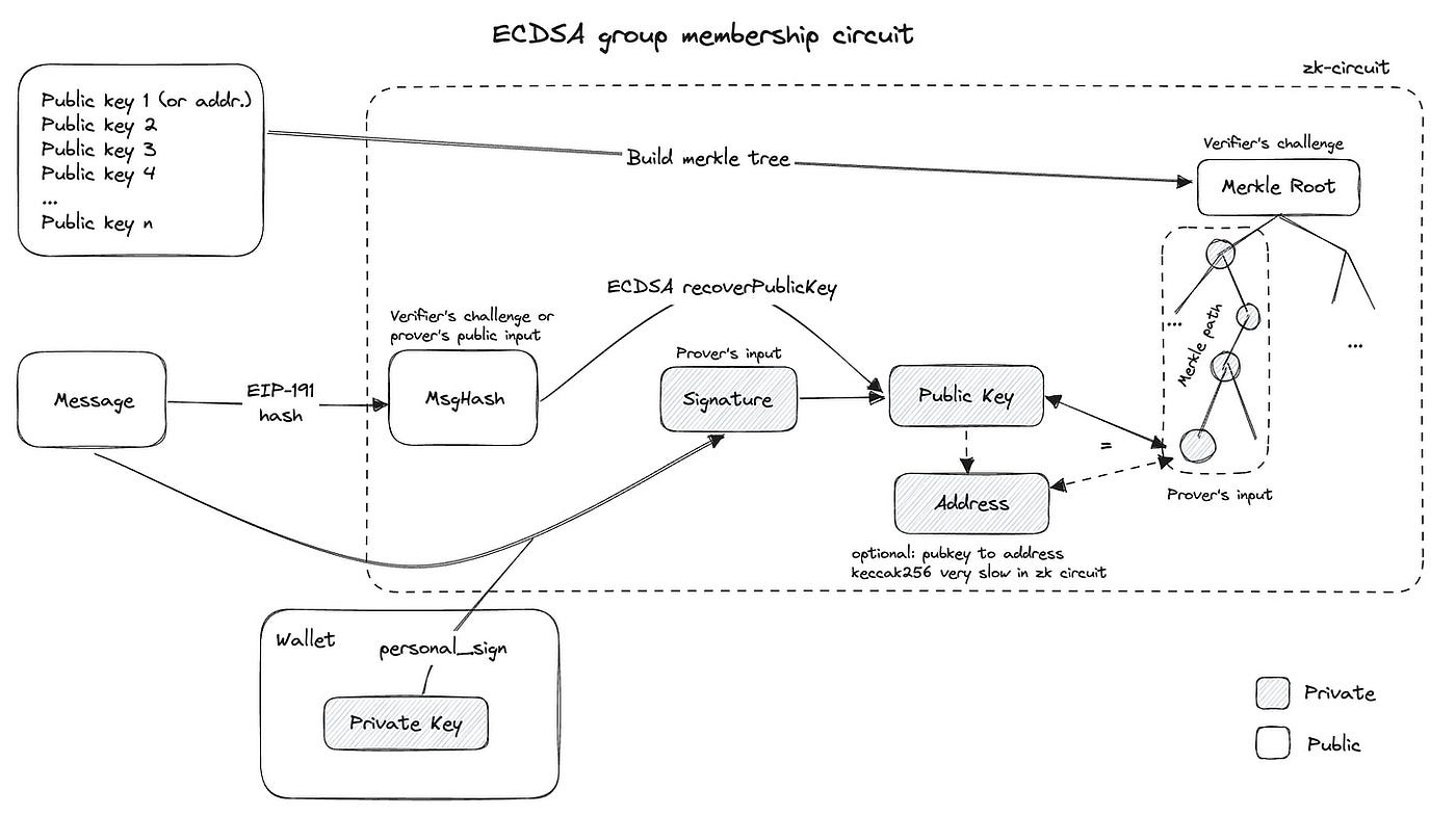 To summarize the chart, the circuit takes in as public input (msgHash, merkleRoot), and private input (signature, merkle path), and produces a proof that the constraints binding the inputs are satisfied.