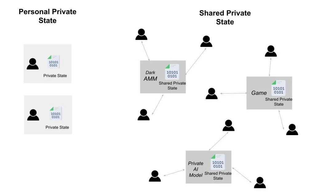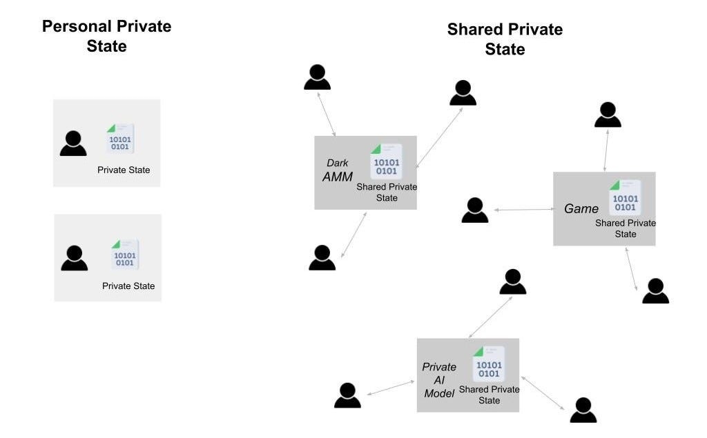 A shared private state (SPS) is private data that multiple people can change/use for computing without breaking privacy. An SPS can be a state that is accessible by anyone and hence can be changed by any user. This can be the state of a dark pool AMM, the state of a private lending pool, etc. An SPS can also be limited to a small group of participants who can access or change the data. Examples of the later include the state of an on-chain multi-player where you only allow the active players to change the state. It can also include private inputs to an on-chain AI model, where only a few entities, e.g., model operator, can run compute over the private data.