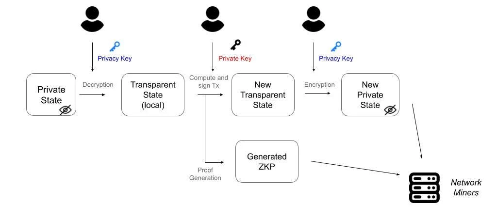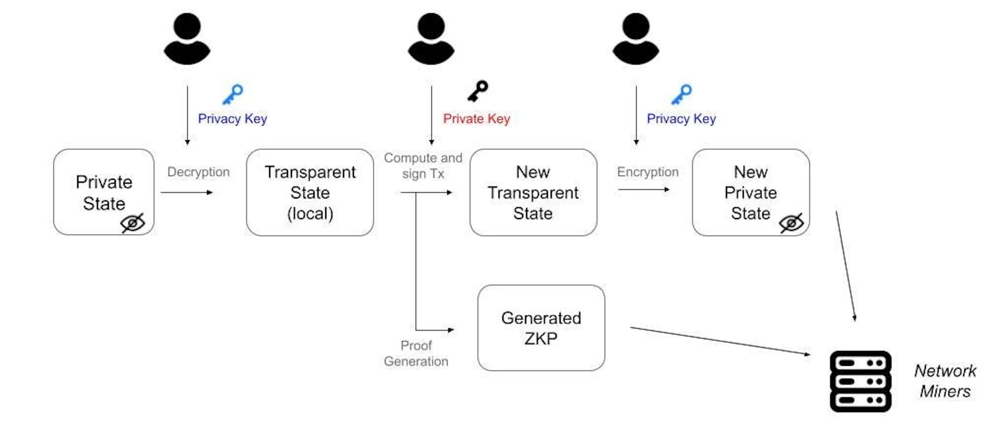 The first approach that emerged to handle on-chain privacy was utilizing ZKPs. This approach is particularly suitable for personal private data. In this approach, the owner of the data can simply decrypt the data locally using their privacy key, do any required changes, encrypt the result using their key, and finally generate a ZKP to prove to the network their changes to the private state are valid.