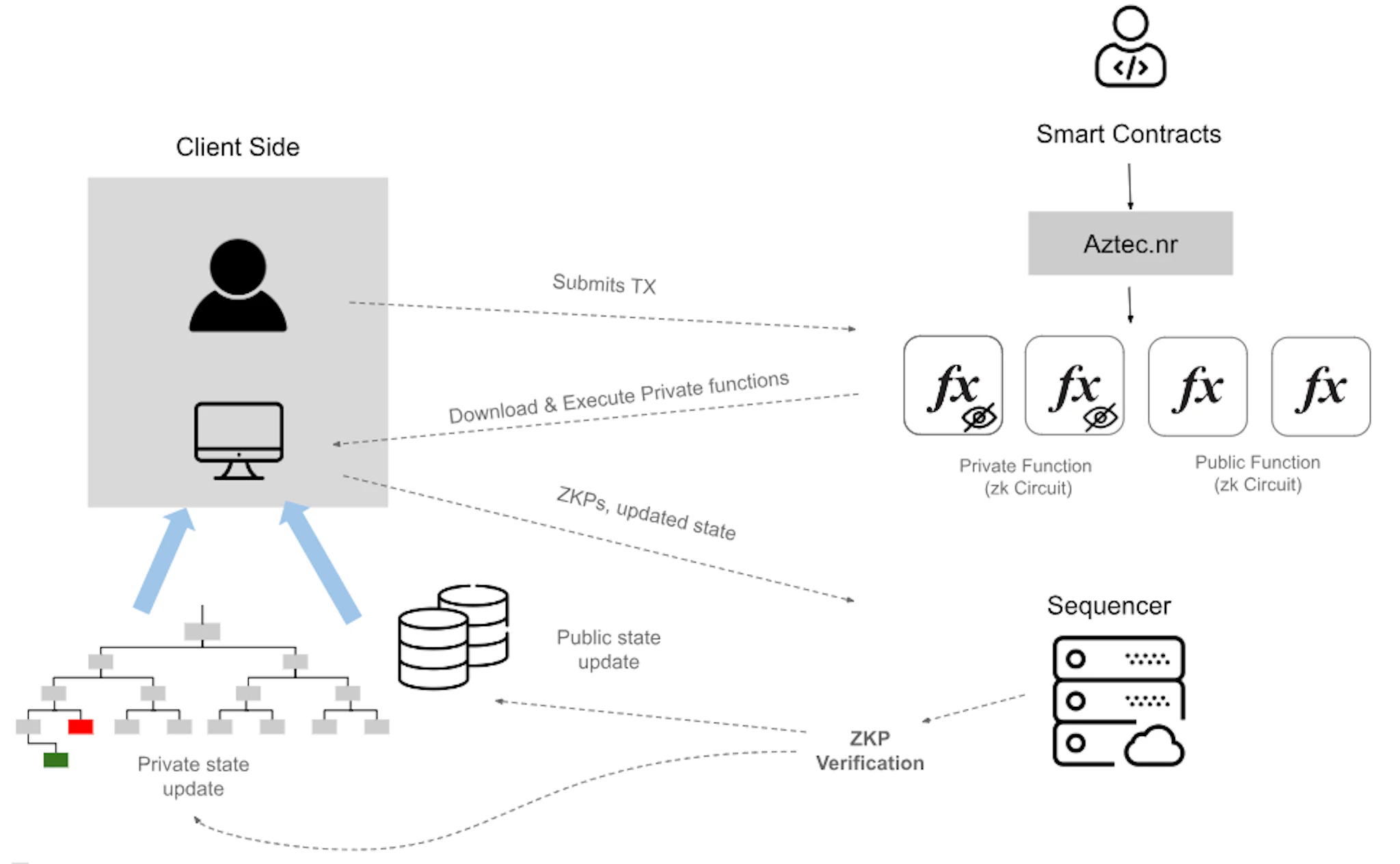 For instance, Aztec uses Noir and its associated smart contract development framework, Aztec.nr, to break every smart contract into a set of functions. Each function is implemented as a zk circuit. Users can perform general computing on their private data by downloading the necessary functions and performing the computing locally on their devices. The details of how Aztec’s smart contract execution were discussed in this thread.