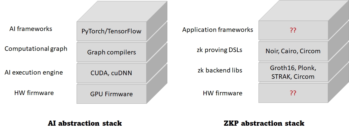 To unlock the potential of ZKPs, several abstraction layers and tooling need to be built. These abstractions are necessary to simplify the development process of ZKP applications and allow each group of developers to focus on what they are best at. For instance, application developers should not worry about the low-level details of zk circuits and how they work. Using the AI analogy again, great progress in AI was possible by creating several layers of abstractions. Using these abstractions, AI application developers do not need to worry about the NN architecture or the hardware resource allocation. Frameworks such as TensorFlow and PyTorch abstract away all these low-level details.
